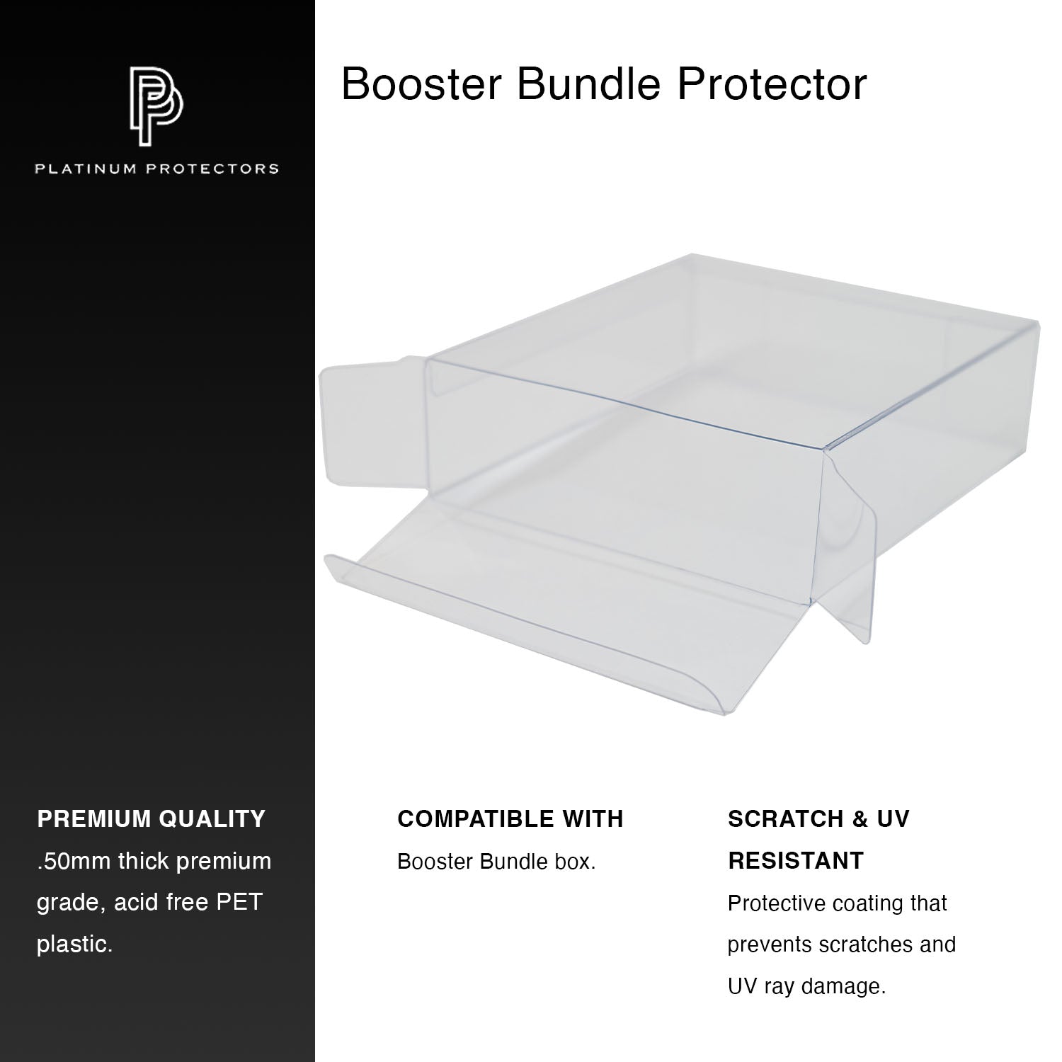 Platinum Protectors unveils its redesigned protectors for Pokemon Booster Bundle boxes. Now UV and scratch-resistant, these protectors keep your TCG boxes pristine, preventing fading and damage. With flat surfaces and sleek, softline edges, they’re easy to assemble and stack flawlessly, outshining competitors’ curved, bulky closures. Crafted from ultra-clear, acid-free PET plastic, our open-end design ensures effortless insertion, superior durability, and a premium display.