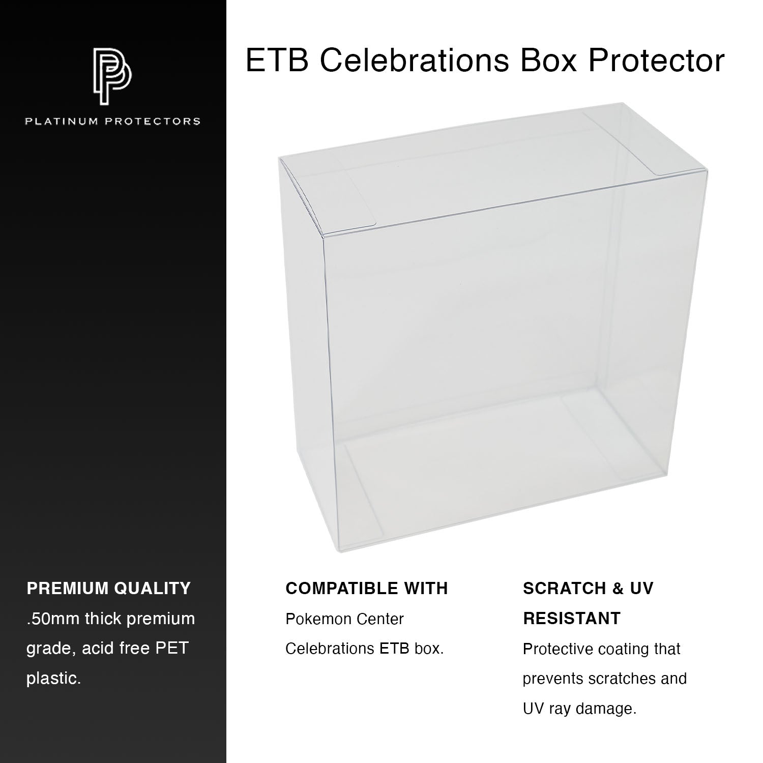 Platinum Protectors unveils its redesigned protectors for Pokemon Center Celebrations Elite Trainer Boxes. Now UV and scratch-resistant, these protectors keep your TCG boxes pristine, preventing fading and damage. Crafted from ultra-clear, acid-free PET plastic, our open-end design ensures effortless insertion, superior durability, and a premium display.
