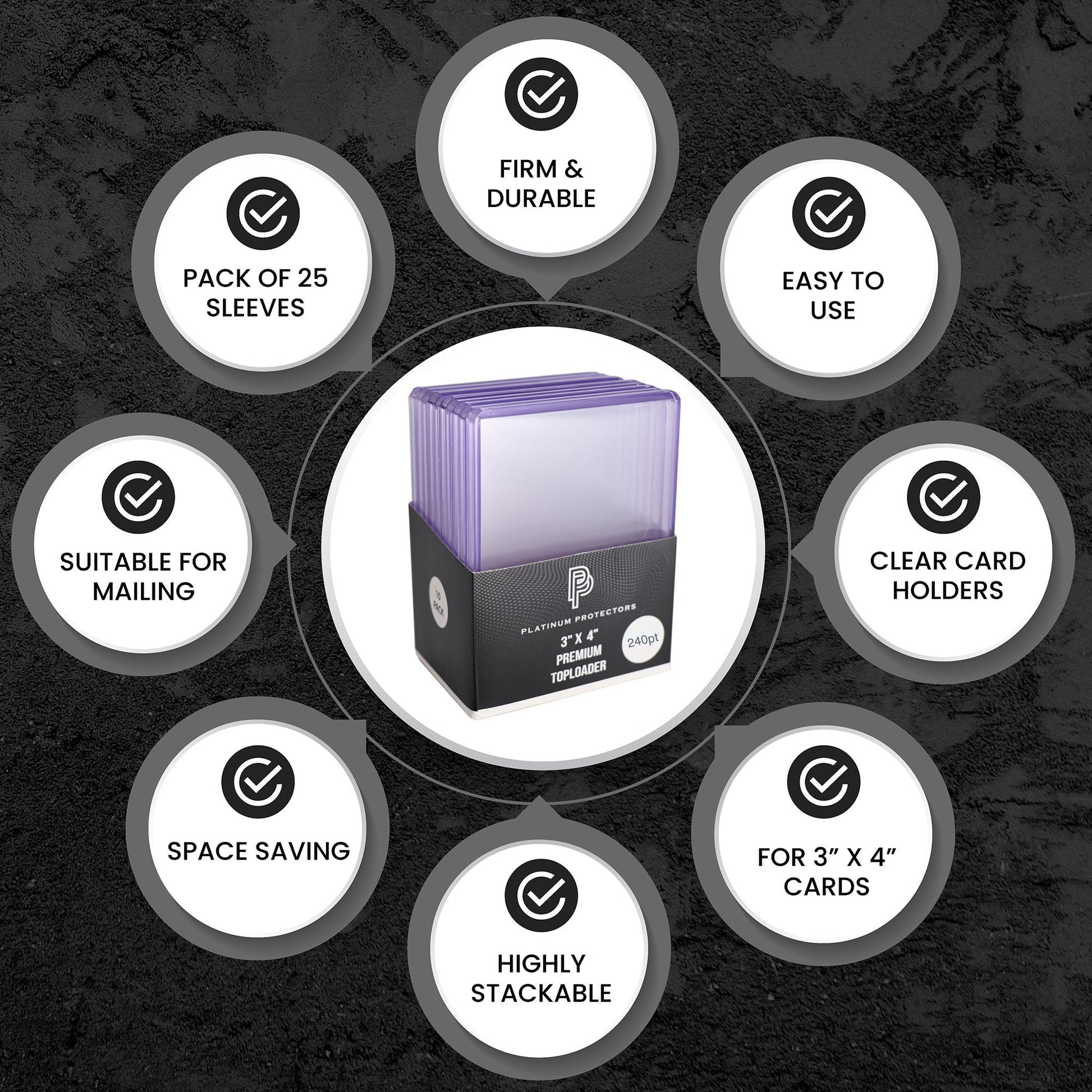 Don't trust your collection with the "standard" or "regular" quality toploaders that have flooded the market. Platinum Protectors premium quality 240pt toploaders are for the serious collector. The perfect way to keep your trading cards safe and secure. Made of durable premium hard plastic. Ultra-clear transparency with no imperfections.