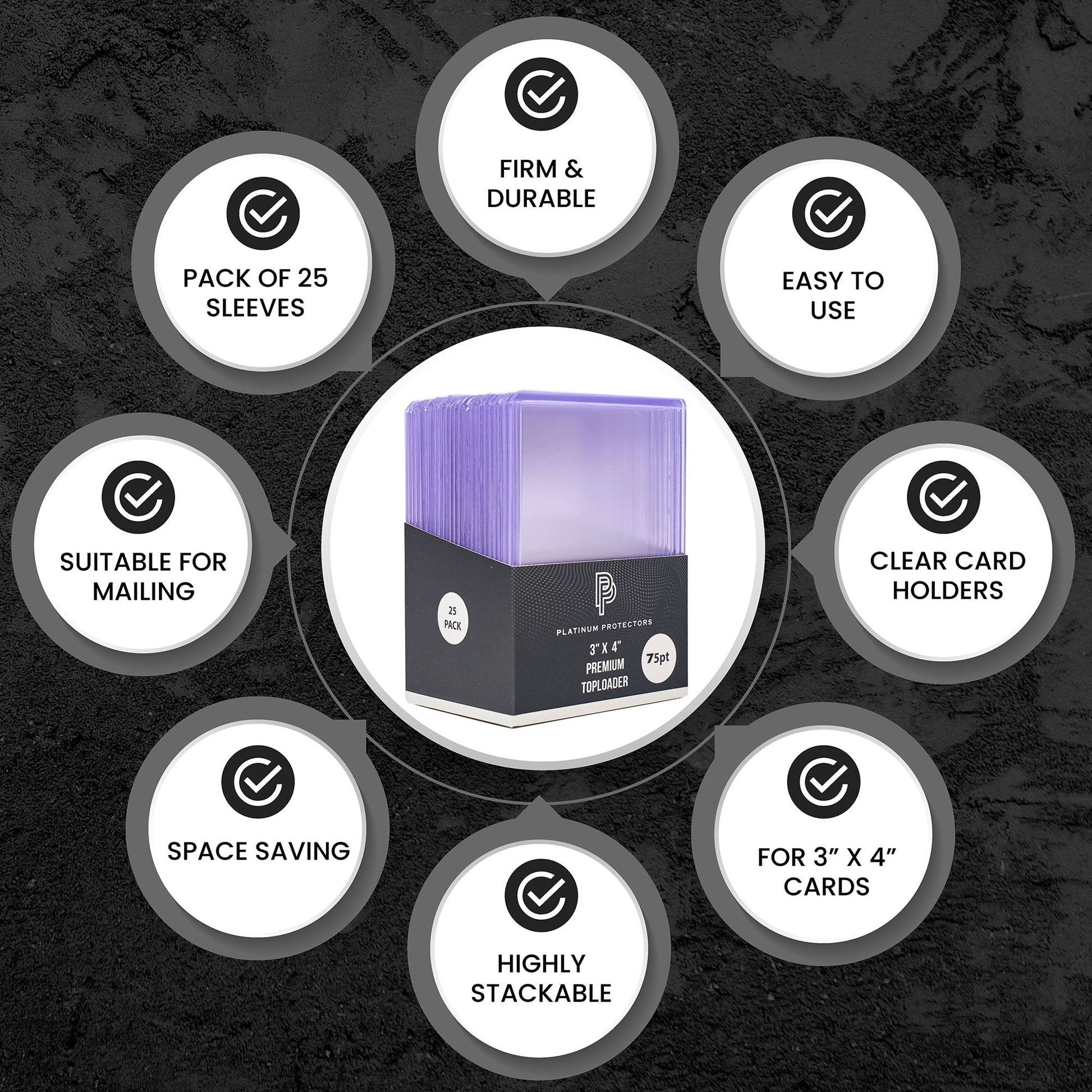 PACKAGE INCLUDES:25-pack(s) of 75pt premium quality toploaders.