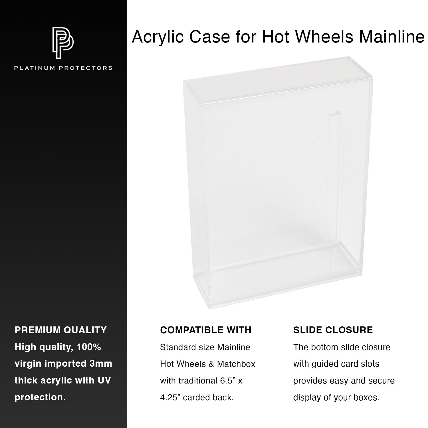 - THICK PREMIUM ACRYLIC: Our premium die cast display cases with sliding bottom closure are made from high-grade 100% virgin imported thick 3mm acrylic. Each case is is wrapped in protective film for extra scratch protection. Then individually bubble wrapped and boxed for maximum protection during shipping.